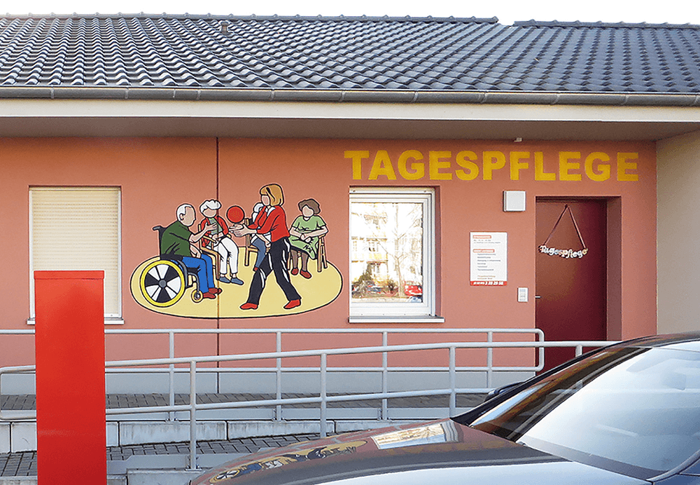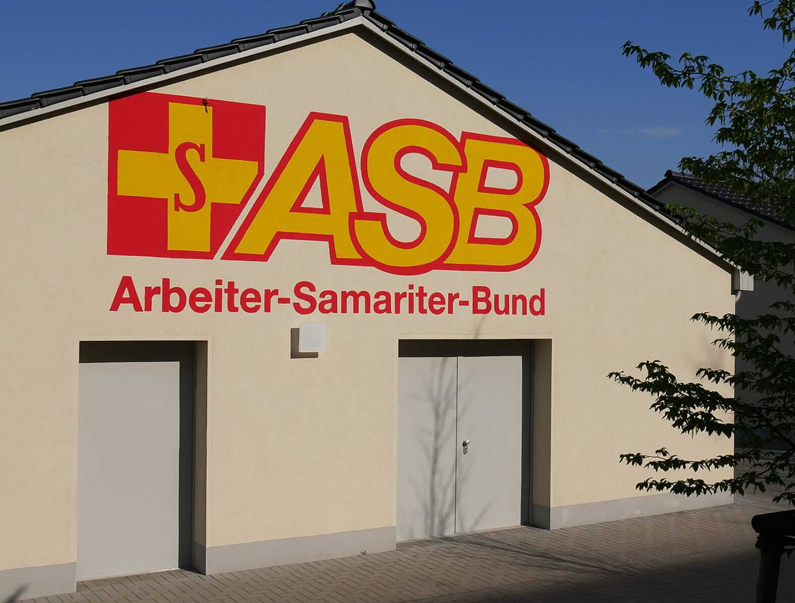 So wird die Giebelfläche schon aus der Ferne zum wirksamen Werbeträger. Auch die Überschriften zu den Leistungsbereichen der ASB sind mit dem Pinsel auf den Putz gebracht.