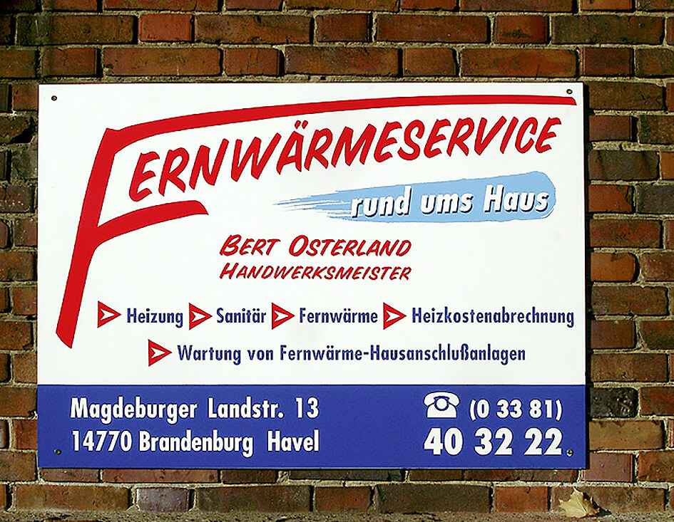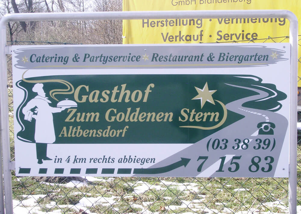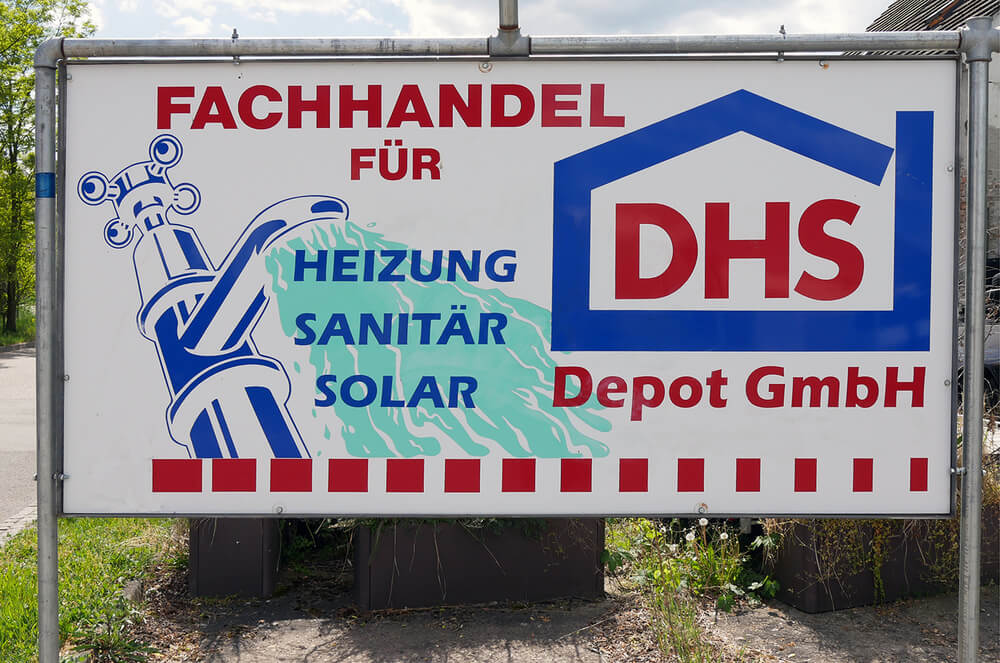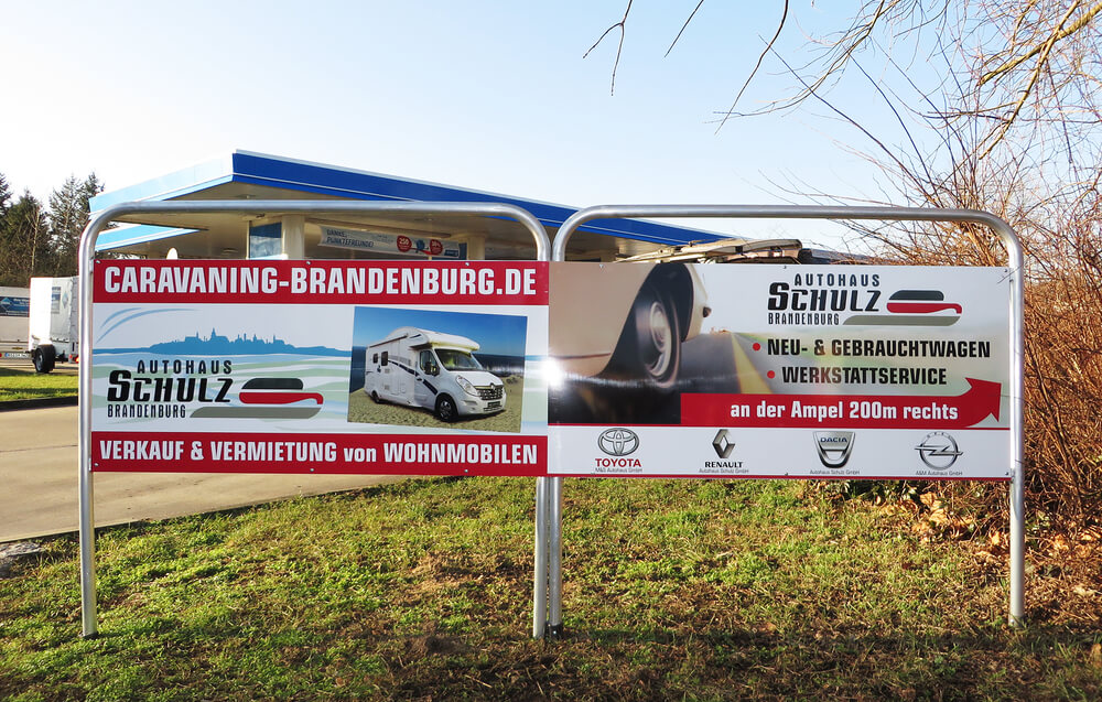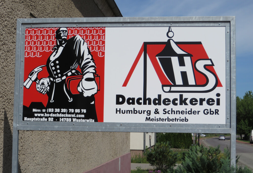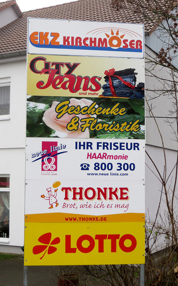 Neben Entwurf und Fertigung der Schilder montieren wir wir auch vor Ort die Werbeträger an den gewünschten Sichtbereich. Dazu ergeben sich zusätzliche An- und Abfahrts- sowie Transportkos-